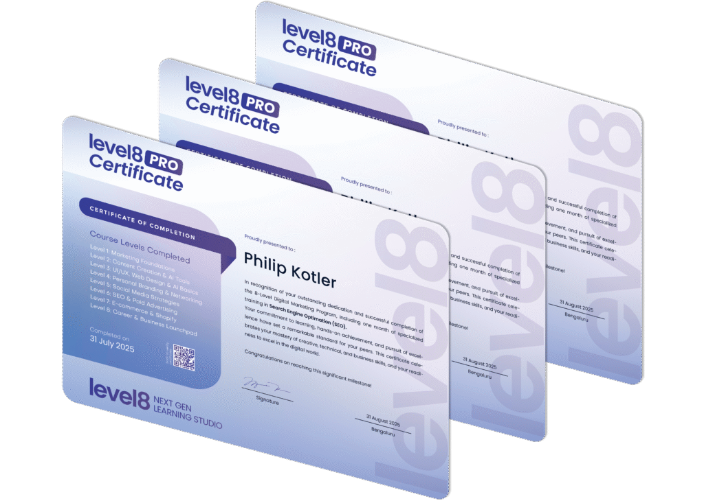 Upon successful completion, you’ll earn the Level8 PRO certificate and a Niche Mastery Award, recognizing your skills and specialization—ideal for showcasing on LinkedIn and to employers.